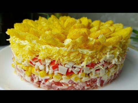 - Крабовые палочки мелко нарежьте и выложите сверху кукурузы, сеточку из майонеза и сверху натертый на мелкую терку сыр.